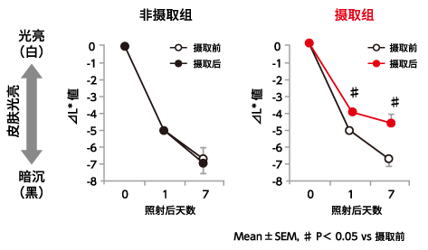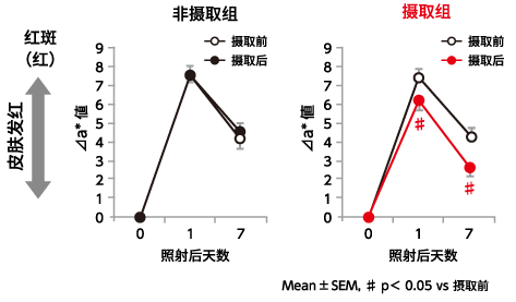 通过5周摄取含胶原蛋白肽和牛奶神经酰胺酸奶的实验,显示皮肤对紫外线抵抗性的MED(最小红斑量)这一数值显著上升,抑制了紫外线照射后皮肤的红斑(见红)和色素沉着。通过持续摄取含有胶原蛋白肽和牛奶神经酰胺的酸奶,可抑制每天的紫外线伤害积累,长期可能有预防光老化的效果。